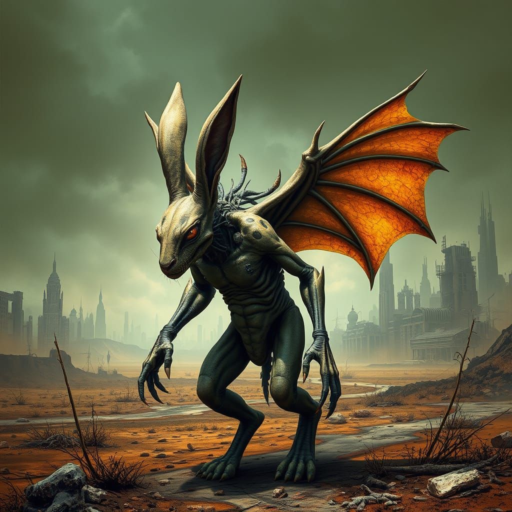 This image shows a twisted, post-apocalyptic creature with rabbit, lynx, and bat features, standing amidst a ravaged cityscape in a dark, surreal world with biomechanical elements.