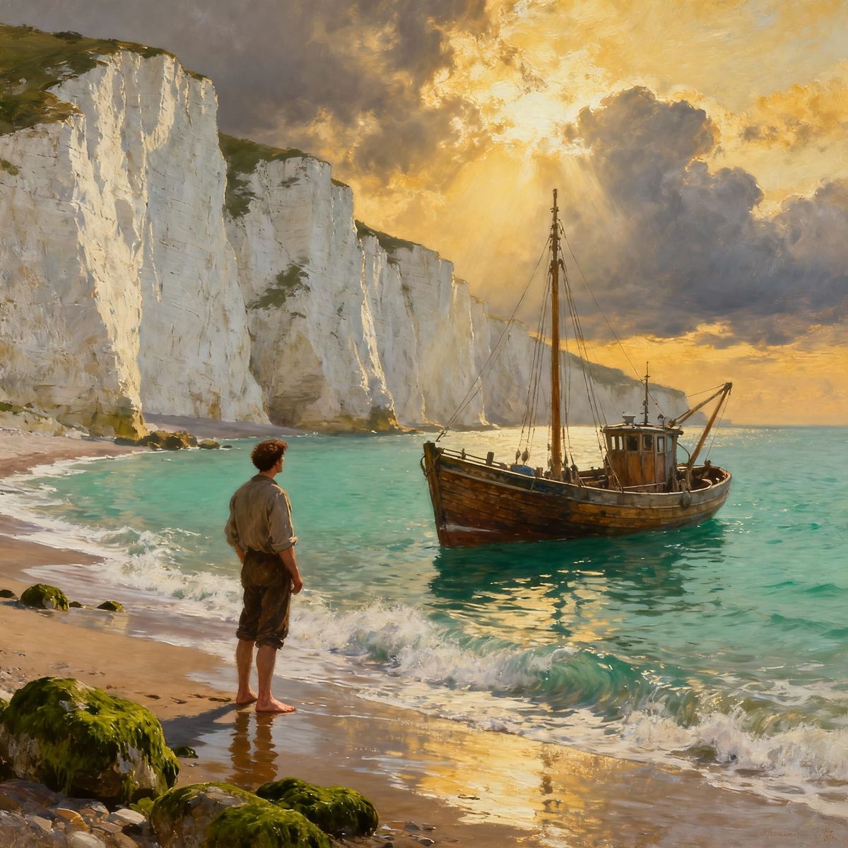 This image depicts a tranquil coastal landscape featuring white chalk cliffs, a wooden fishing boat, and a lone figure on a sandy beach. The scene is rendered in a photorealistic oil painting style with dramatic lighting.