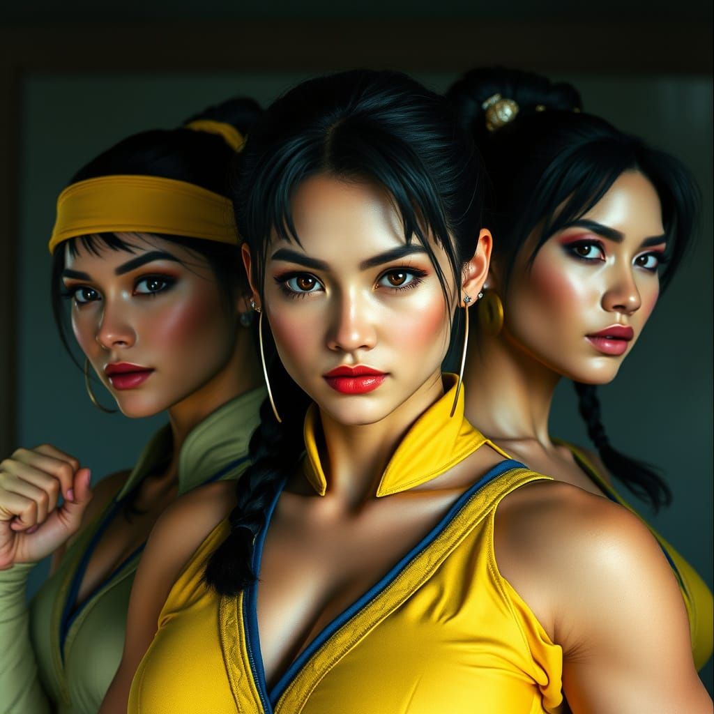 A cinematic film still of Chun-Li, Cammy, and Juri, inspired by the styles of Simon Stalenhag and Ian McQue, with realistic costumes, detailed skin, and natural expressions, set in a sandy arena.