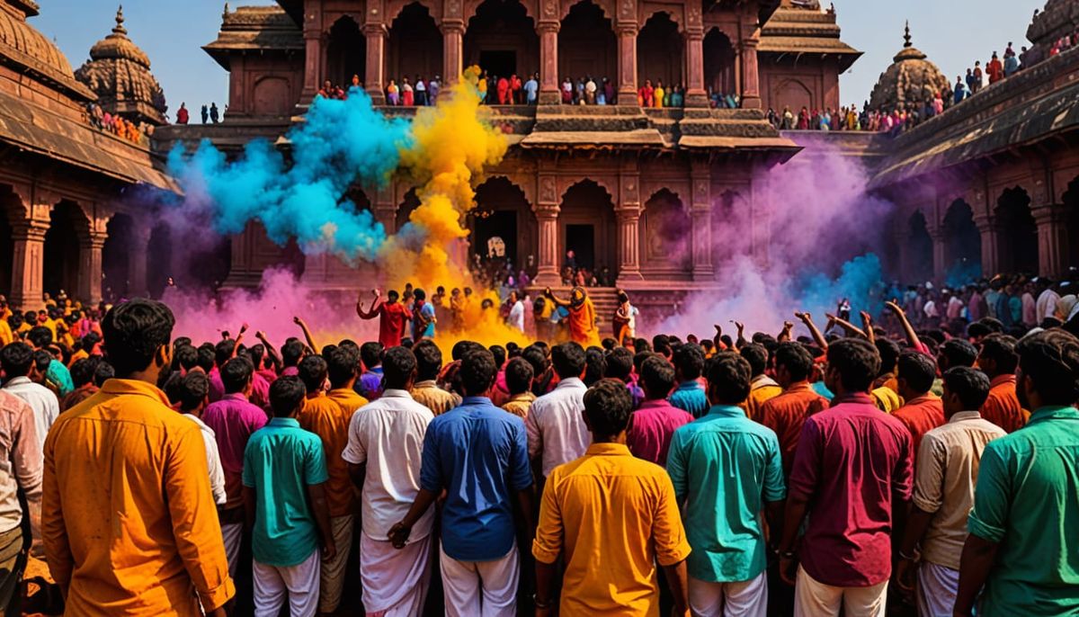 This image shows a colorful scene of people celebrating the Holi festival in an old Hindu temple, marking the end of winter and the beginning of spring in India.