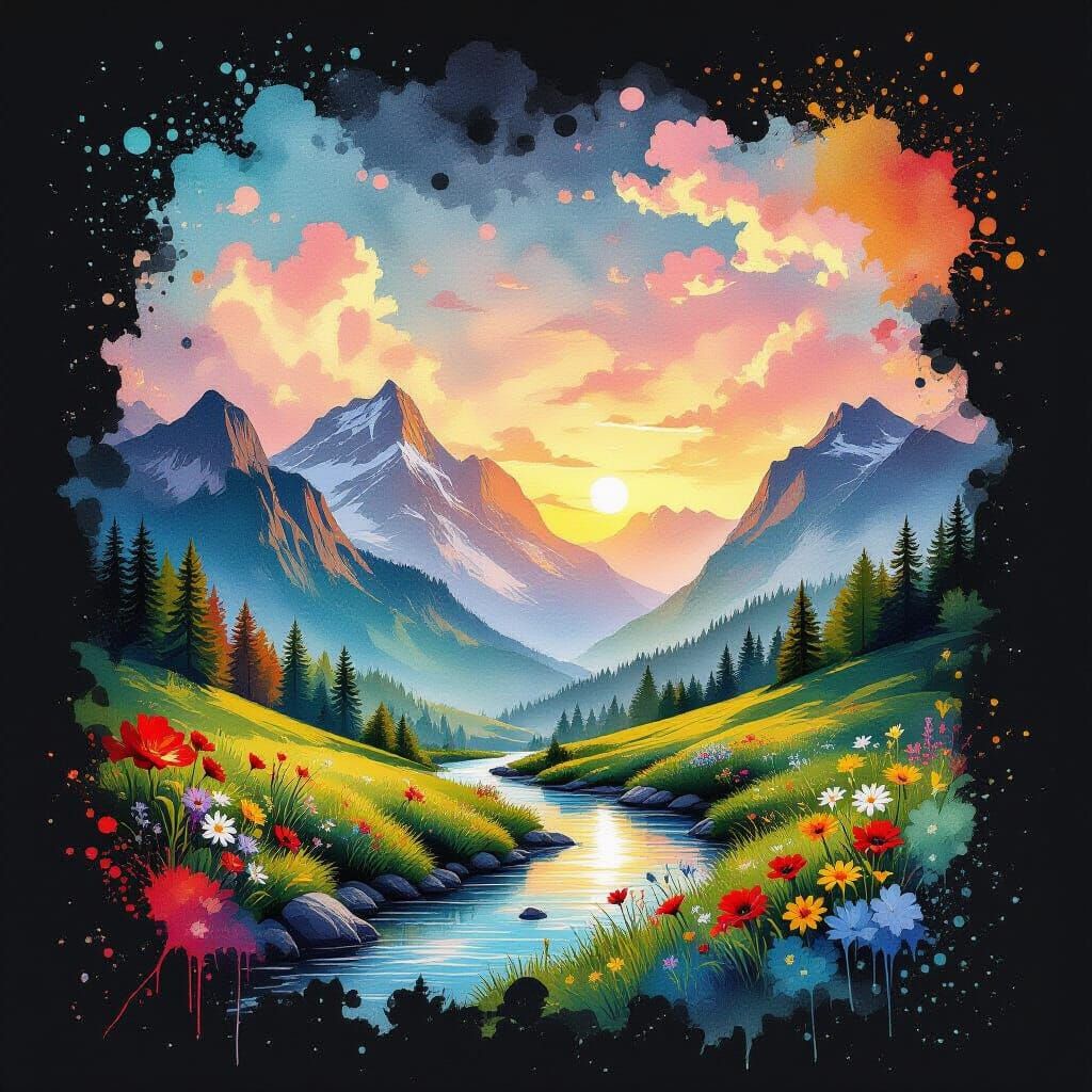 A vibrant watercolor double exposure of a mountain valley at sunset. The colorful paint splashes of red, green, yellow, and turquoise blend to capture nature's tranquil essence in an expressionist style.