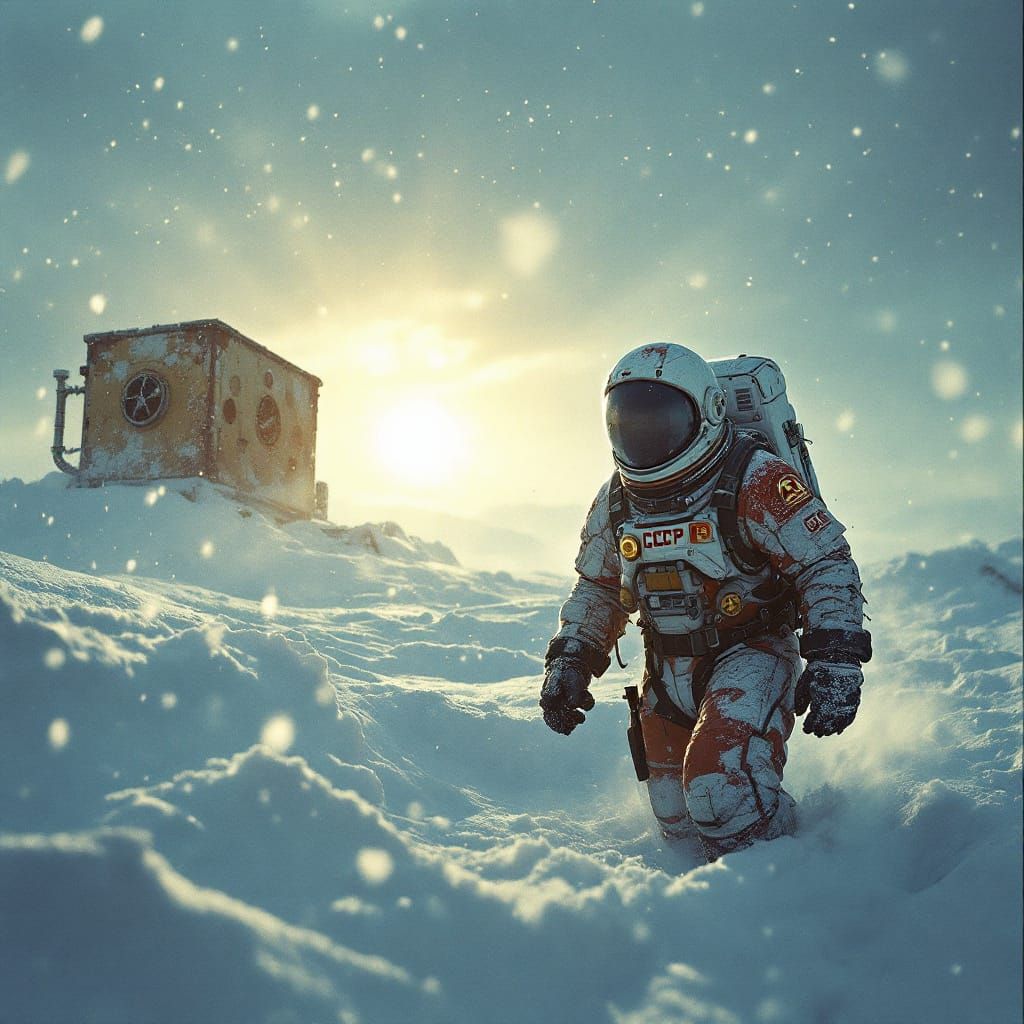 A cinematic photograph captures a lone Soviet explorer in a retro-futuristic suit battling a blizzard on an alien planet. Dim sunlight creates volumetric shafts through the swirling snow.
