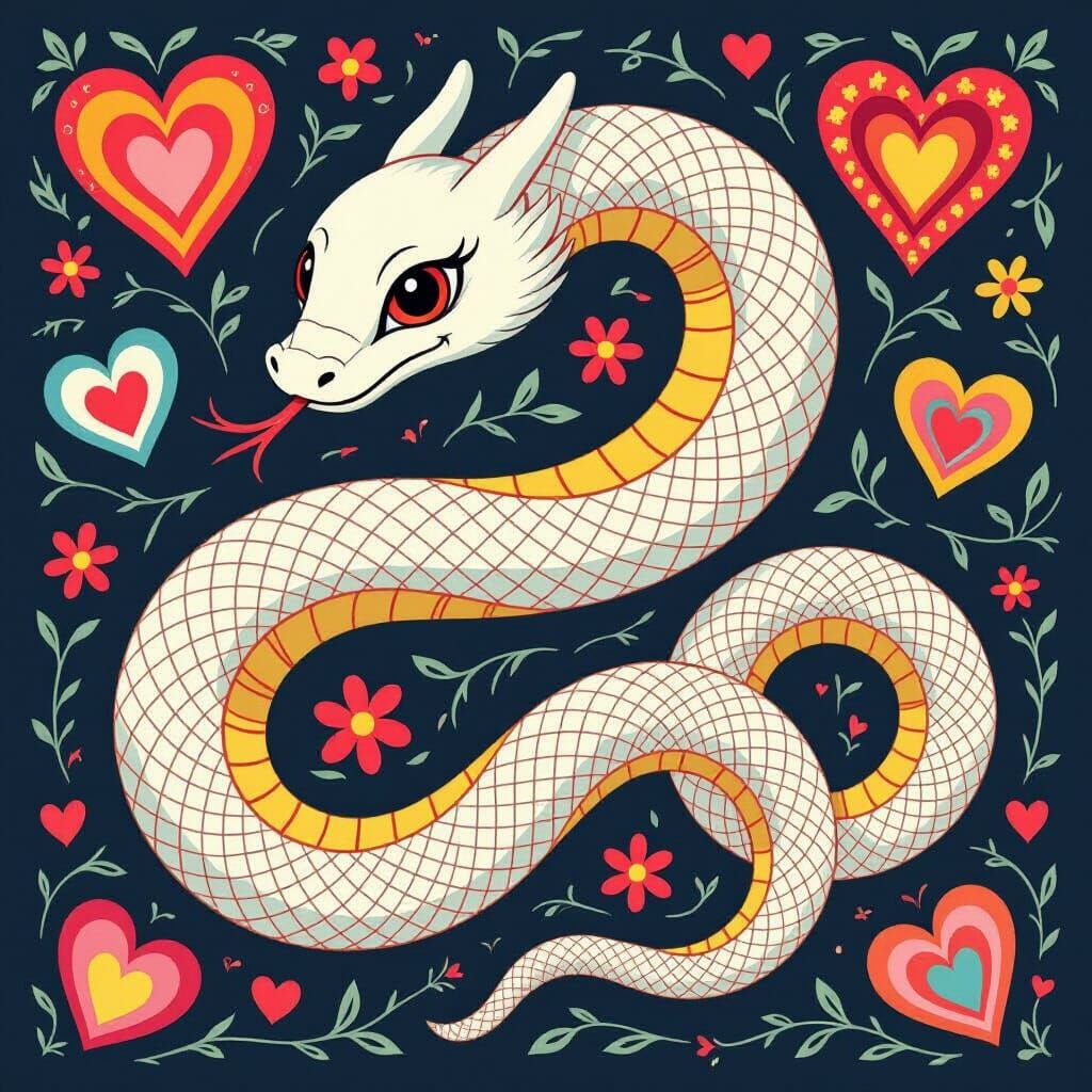 A vibrant image of a white snake surrounded by love hearts. The artwork features bold lines and playful, delicate patterns in a pop art style.