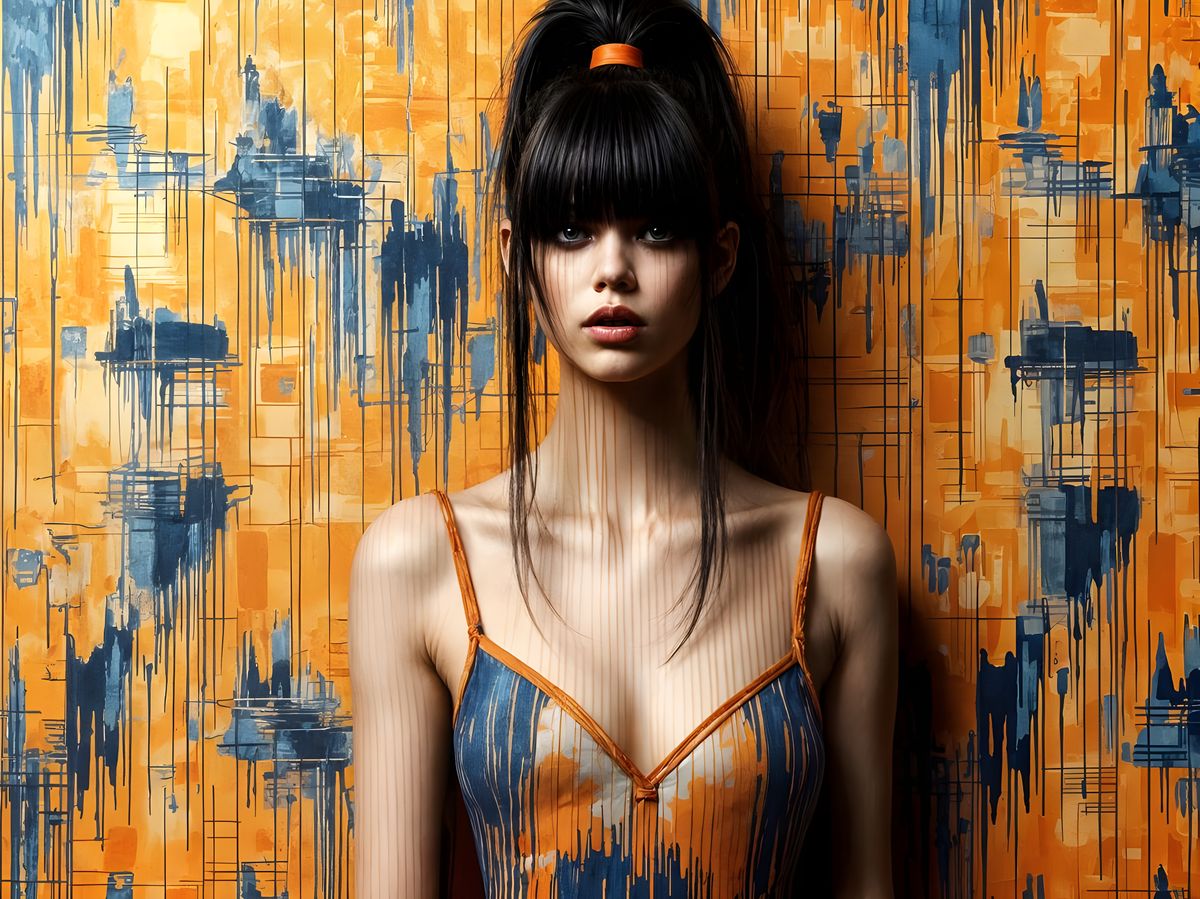 A digital rendering of Sydney Sweeney in a low-cut dress. She has blunt bangs covering her eyes, a high ponytail, and a vivid backdrop of electric orange and blue lightning-patterned wallpaper.