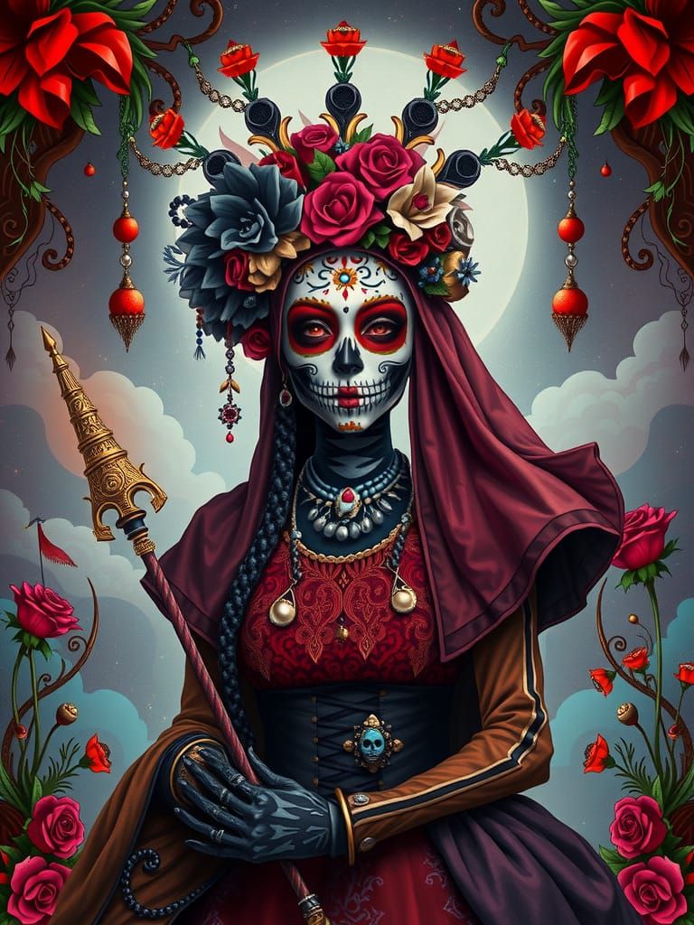 This image shows an astral shaman in Victorian dress with sugar skull makeup. The digital art blends folk art and cutecore clowncore textures in a dystopian style.
