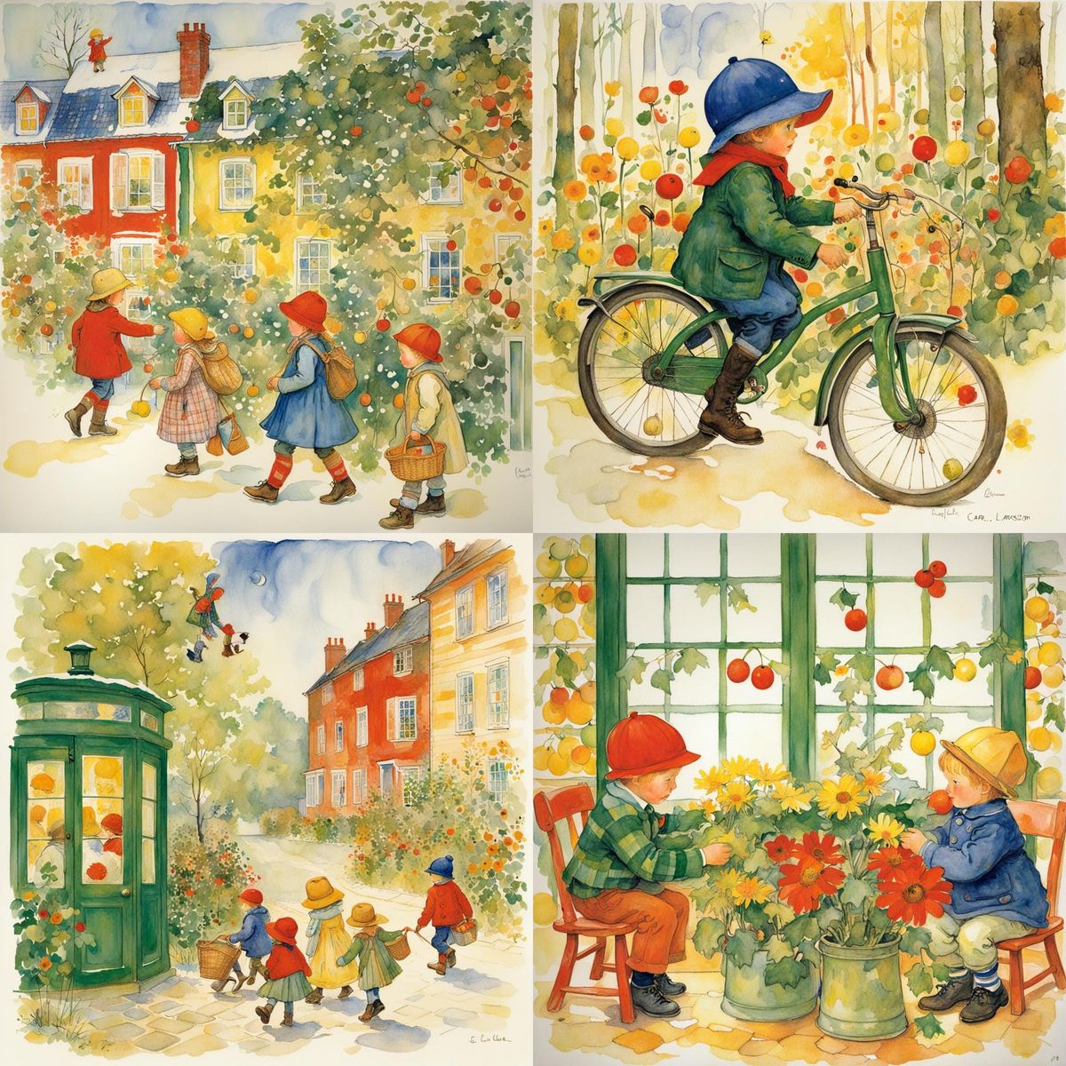 This image shows art inspired by children's book illustration. The artwork has simple shapes, soft colors, and a focus on themes of nature and home.