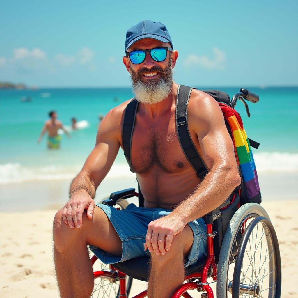 A colorful portrait of a smiling man in a wheelchair, surrounded by a bright beach scene, featuring bold colors and lively atmosphere, reminiscent of classic American art