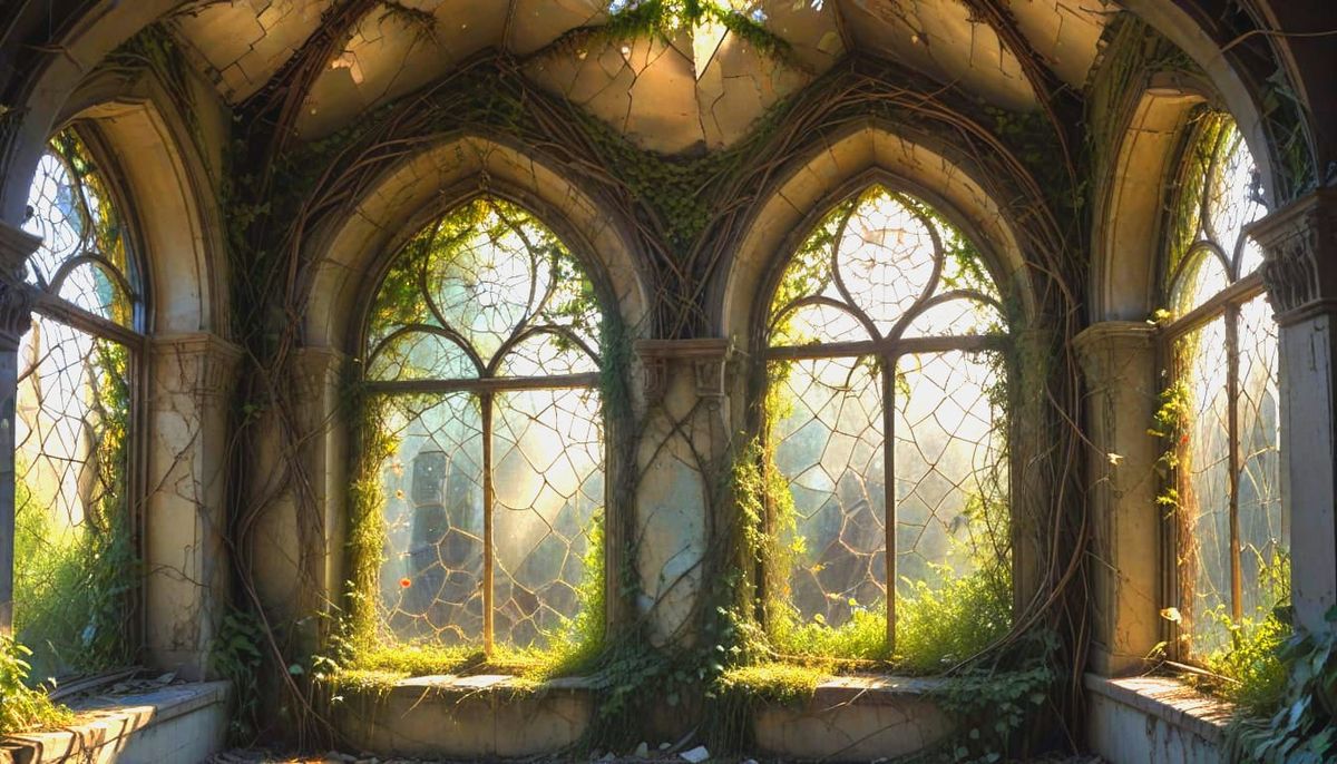 This image shows a gothic scene with sunlight streaming through a broken glass dome. A crumbling wall is overtaken by vines and flowers in an impasto style.
