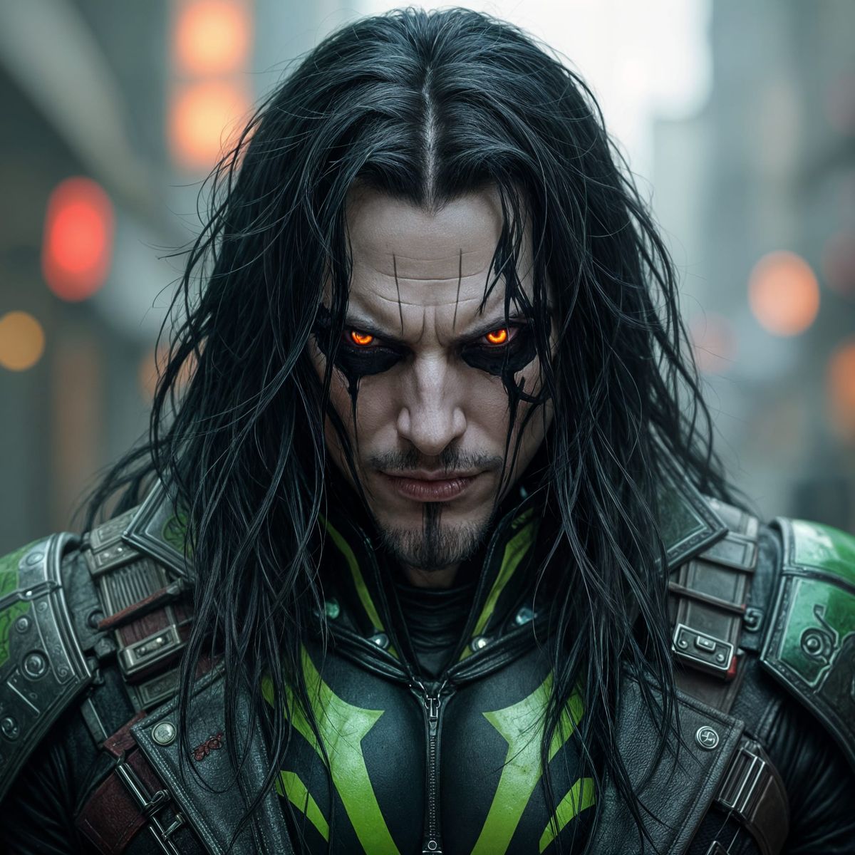 A hyperrealistic close-up of a character with long black and green hair, incorporating cyberpunk elements. The image focuses on detailed textures and a fusion of styles.