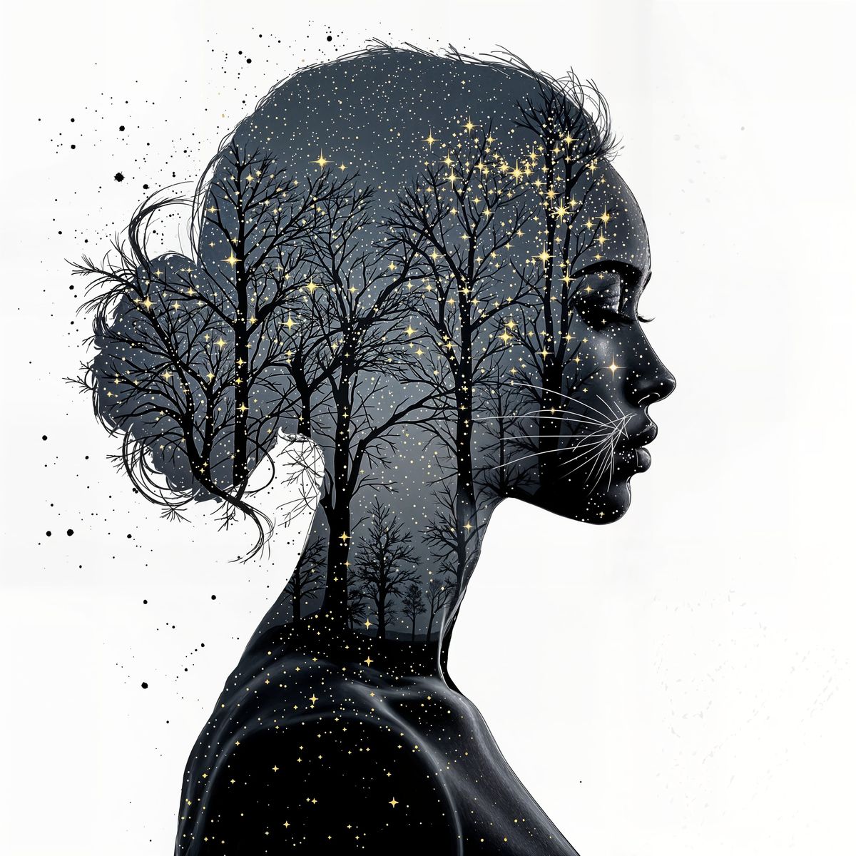 This digital artwork showcases a woman's silhouette against a starry night forest, merged with a leopard's spotted pattern and textured fur, set against a white background with subtle brushstrokes.