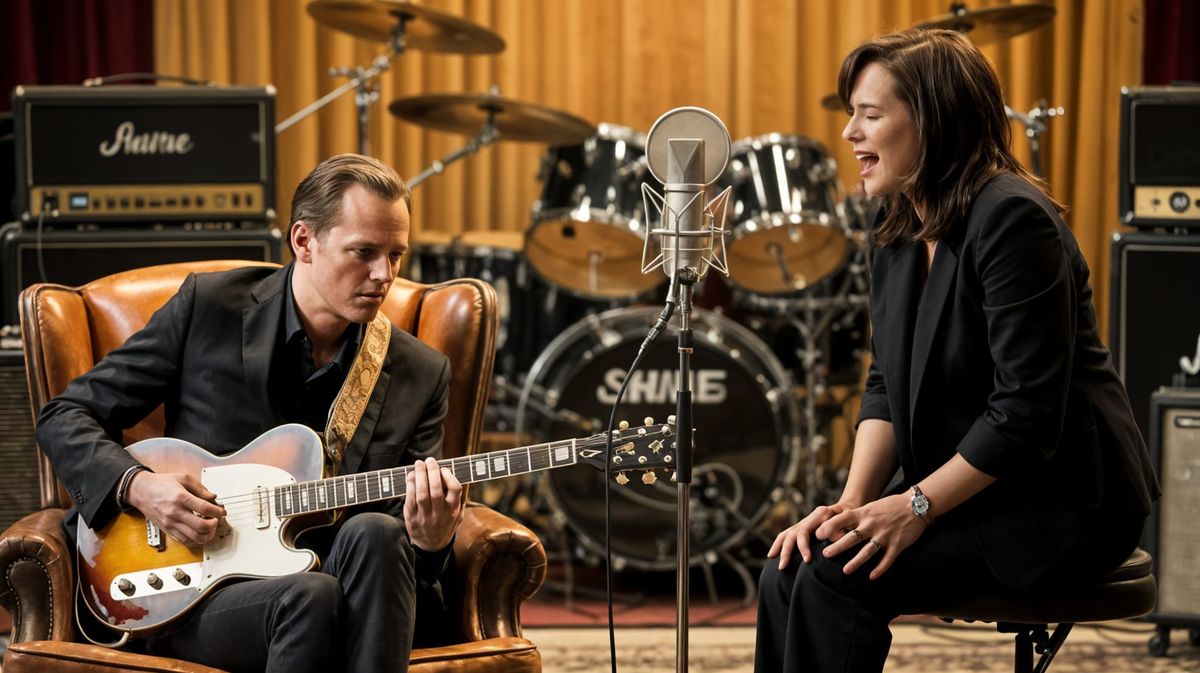 A photorealistic image captures a blues guitarist and singer performing in a detailed audio studio. Features cinematic lighting and a focus on intricate detail.
