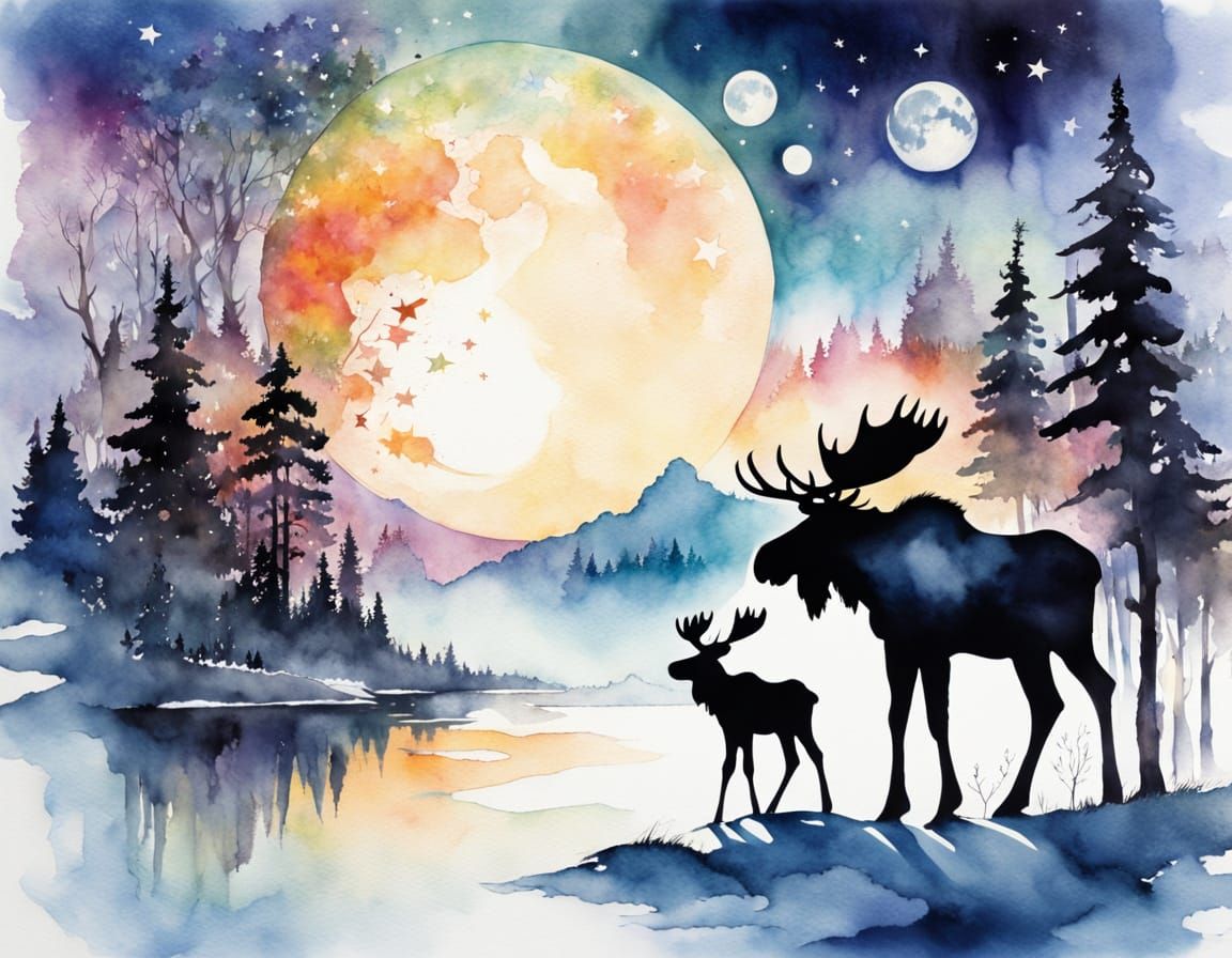 This image features a serene watercolor landscape with a majestic moose standing under the night sky, illuminated by the vibrant colors of the northern lights.