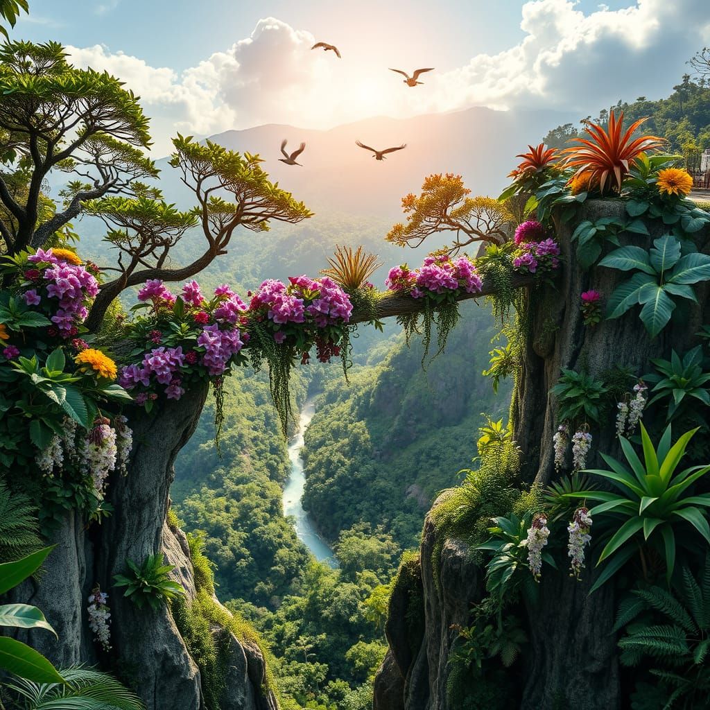 Tropical flowers hover over a green valley on the slope of a majestic extinct volcano, lined on the sides by dense forest areas. Rich vines of exotic leaves and colorful flowers form a natural connection betwine the trees to elaborate platforms and ponds in the air. Orchids of different colors and shapes grow in loose clusters in the branches of the trees and hang from overgrown branches. Hummingbirds fly majestically through the sun-warmed air and butterflies play in the sky.