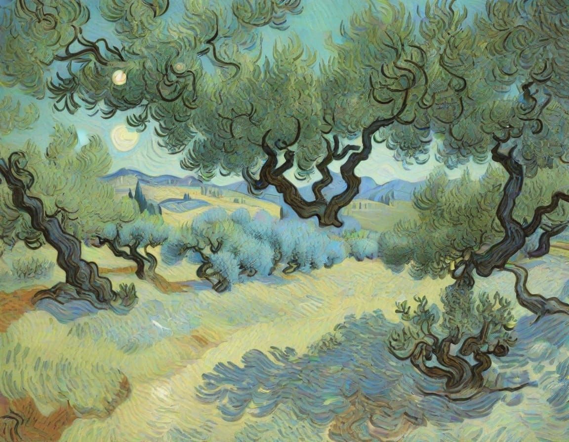 A vibrant image of an olive grove under a bright blue sky, rendered in the style reminiscent of post-impressionist paintings with thick brushstrokes and intense colors.