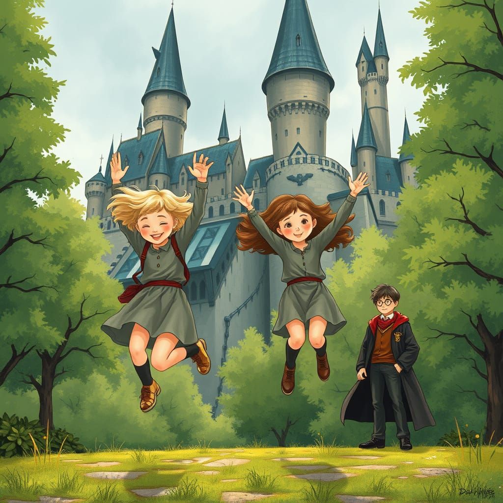 A vibrant image depicting two young girls with Harry Potter near Hogwarts. The scene is filled with lush greenery and rendered in a whimsical style with intricate details and textures.
