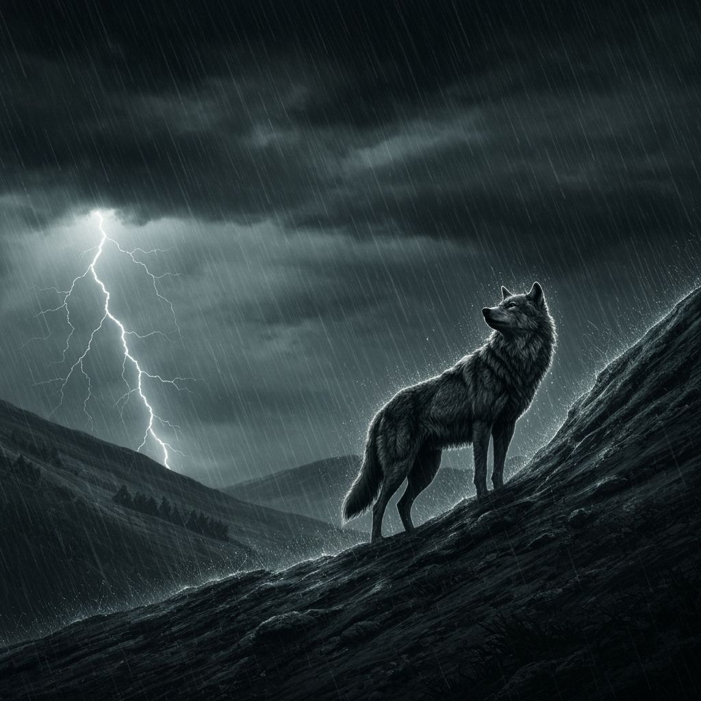 A dramatic image of a wolf silhouetted on a hill against a stormy sky. The scene evokes gothic landscape art through its moody atmosphere and intricate details, creating a powerful and untamed picture.