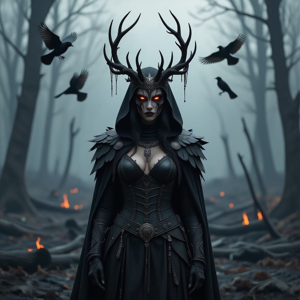 A striking picture of a horned queen standing before a scorched forest. She wears a bone mask and antler crown, with ravens circling above in this hyperreal horror scene. Dark brown, coal black, and muted crimson tones.