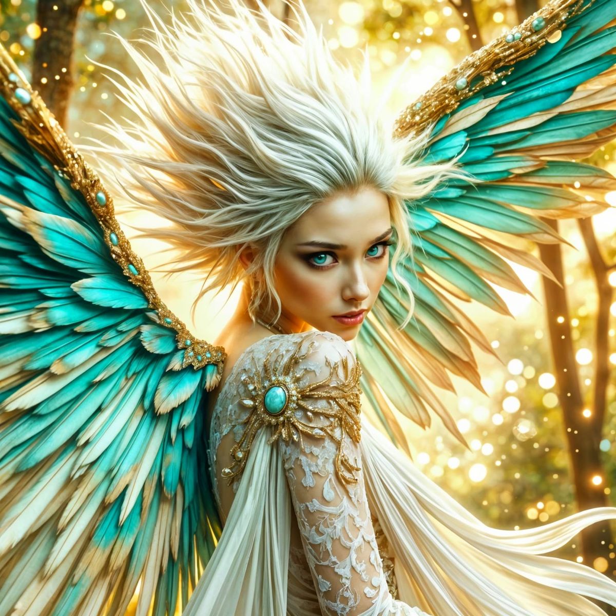 A digital gouache ink watercolor illustration of a majestic bird-woman with wild white hair. She has a slender body, turquoise and white feather patterns, and wears flowing white and gold attire.