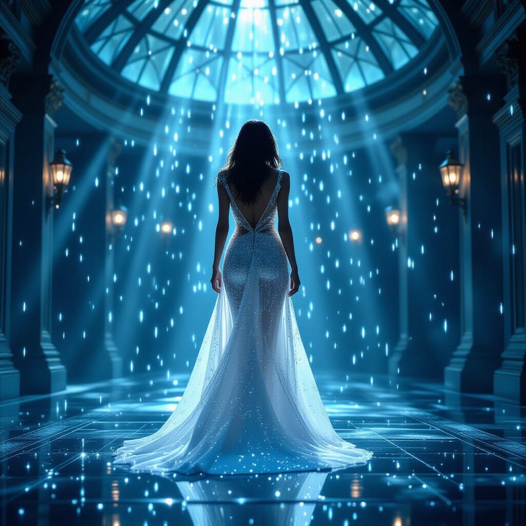 This image shows a woman in a sparkling rhinestone dress walking under a glass dome amidst a rain of light. Spotlights create a diamond-like effect, conveying a sense of decadent power. Rendered in a detailed fantasy concept art style with complementary colors.