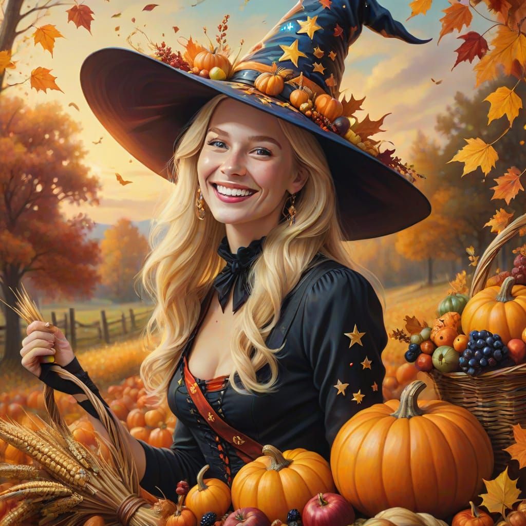 This image shows a joyful woman in an ornate witch hat laughing beside a cornucopia filled with autumn harvest, depicted as a vibrant, detailed oil painting with a dreamlike, opulent aesthetic.