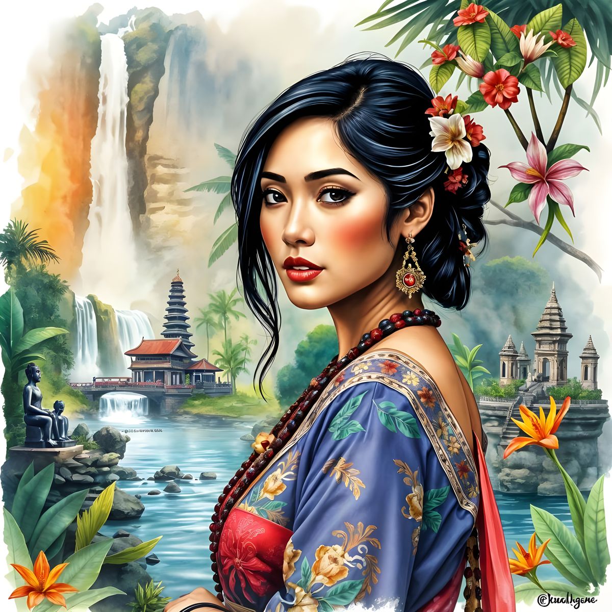 This watercolor drawing captures a Balinese beauty in traditional attire beside jungle waterfalls and ancient temples. The artwork features vivid colors and a whimsical, detailed style.