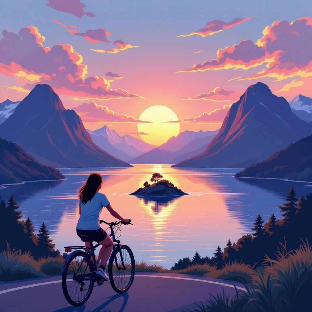 This image depicts a woman on a bicycle overlooking a serene bay at sunset. A lone island and detailed mountains frame the scene, with golden light reflecting on the water. Rendered with illustrative detail and realistic textures.