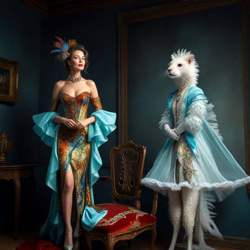 surreal incongruous fanciful whimsical scene with benign strange fictitious animal creatures and unexpected arrangement of incompatible elements in absurd bizarre composition; full-height image of lively magnetic captivating mature lady elegantly dressed in unusual multicolored retro-style outfit, natural ...
