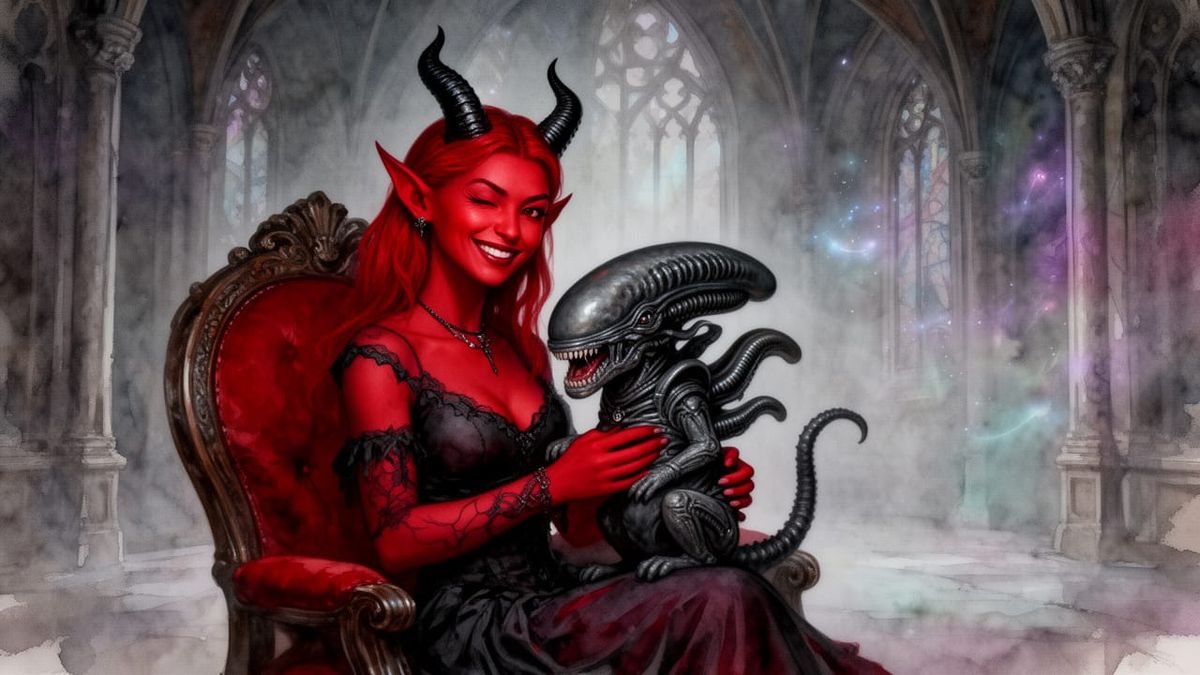 This image shows a surreal red-skinned tiefling in a gothic dress, holding a baby alien cat. The scene is set in a castle hall with a playful, eerie atmosphere, rendered with soft, blended textures and painterly brushstrokes.