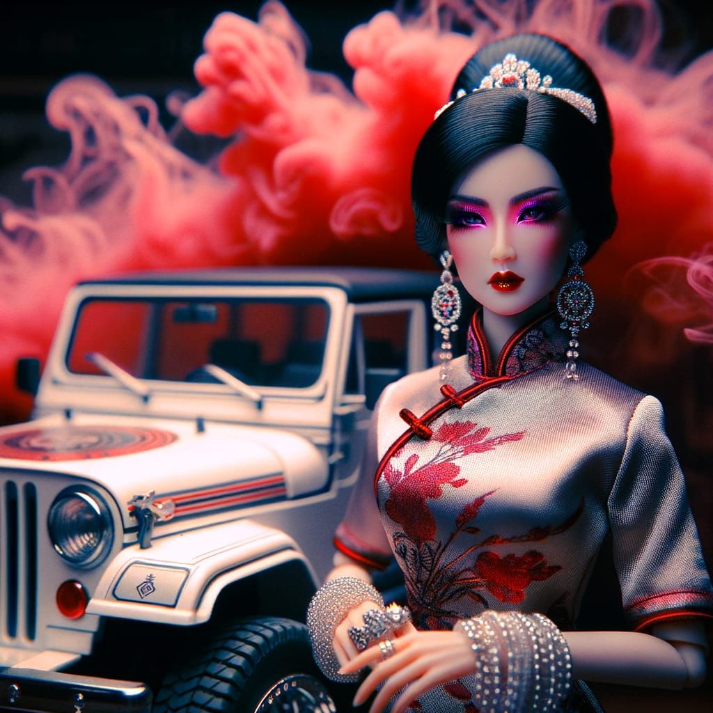 This image shows a stunning adult Chinese woman with an hourglass figure, elegant hair, and striking red makeup, surrounded by luxury and glamour, with a sophisticated white jeep and whimsical red smoke, in a cinematic film still style