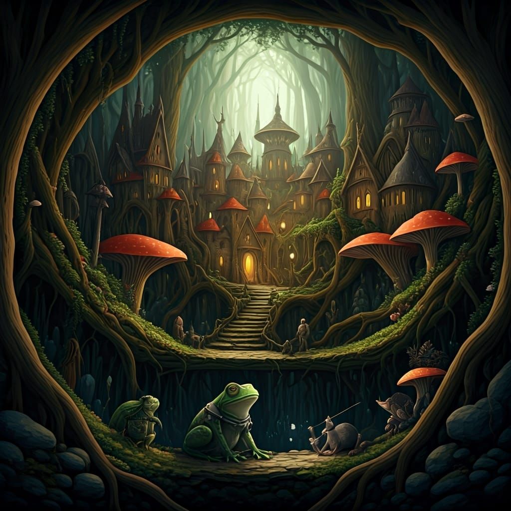 A fantastical elven city is nestled within the roots of an ancient tree. Glowing mushrooms and firefly lights illuminate frog knights guarding bridges, in an intricate, detailed style.