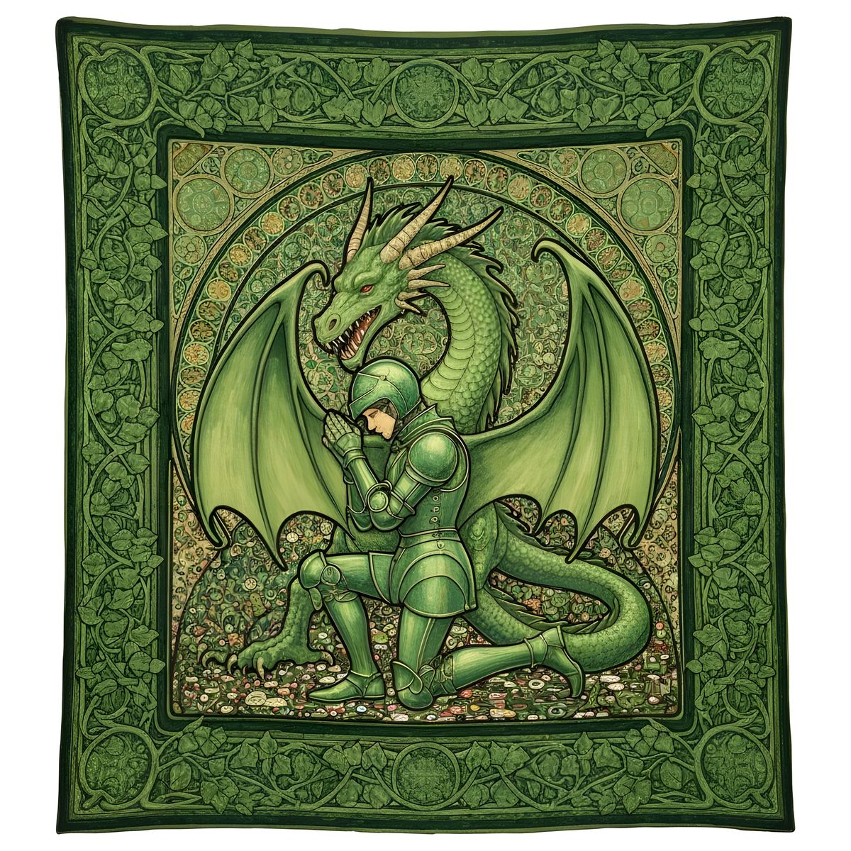 This image displays a highly detailed Art Nouveau tapestry featuring a knight in green armor kneeling before a green dragon. The edges are intricately embroidered with green vines.