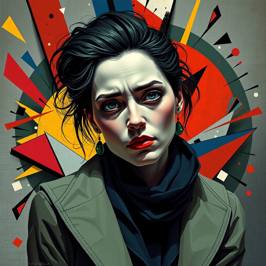 A digital painting of a woman amid geometric shapes and vibrant colors. The image incorporates cubist, art deco, and fauvist elements, rendered with hyper-realism in a maximalist vector style.