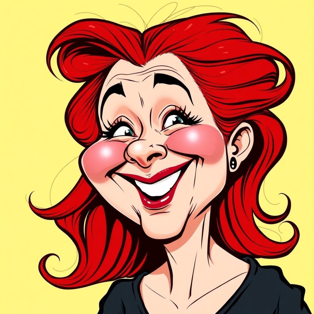 This image features a humorous, exaggerated caricature of a woman with bright red hair and rosy cheeks, depicted in a bold, graphic style with fluid lines and expressive shadows.