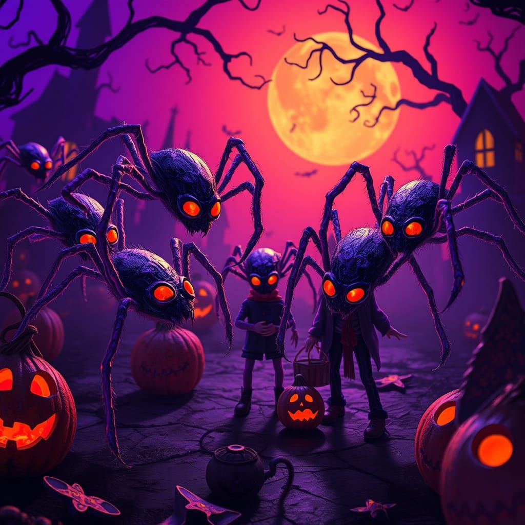 This image captures a surreal Halloween night where spider candies with glowing eyes frighten children. The scene features a vibrant purple and orange gradient light, evoking a gothic, macabre aesthetic.