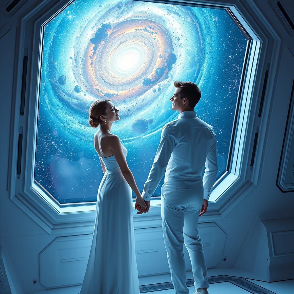 This image shows a young couple in white gazing out the window of a futuristic spaceship. They admire the Andromeda galaxy in an iridescent, ethereal scene with clean lines and shimmering colors.