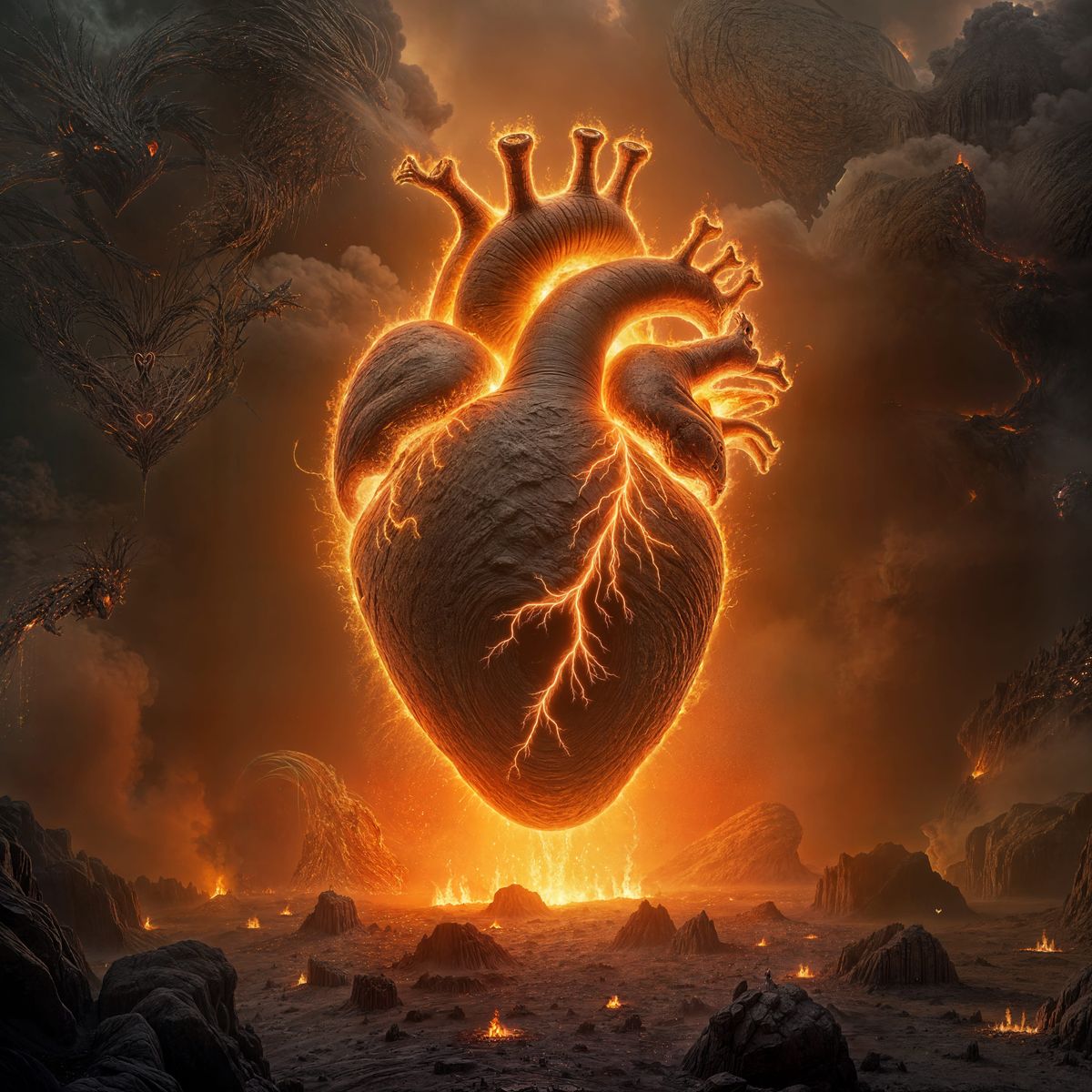 A striking picture of a human heart composed of fire and burning embers. The image is a digital matte painting with cinematic, dramatic, and highly detailed elements.