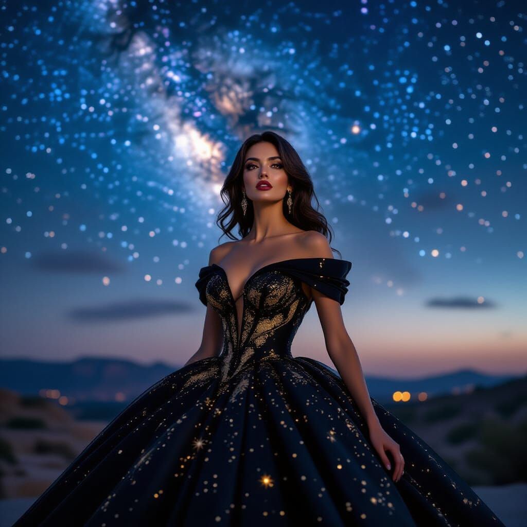 This cinematic image captures a brunette woman in a black fantasy ballgown with gold makeup under a starry night. Realistic film still with dramatic lighting and deep colors.