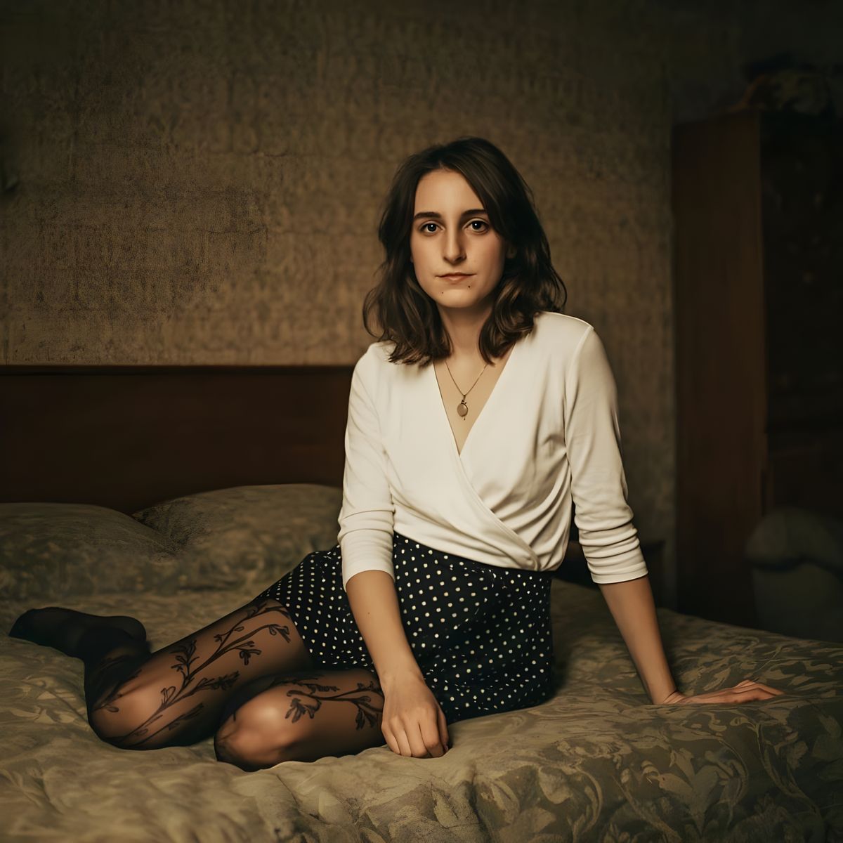This image features a young woman in a relaxed pose, exuding a calm and serene atmosphere. She's surrounded by a soft, natural light and a subtle, patterned background, with a focus on her elegant, feminine features.