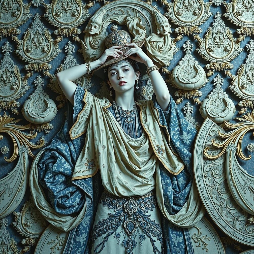 A captivating image of a woman in elegant clothing amidst luxurious decor. The artwork showcases intricate patterns and rich colors, reminiscent of art nouveau.