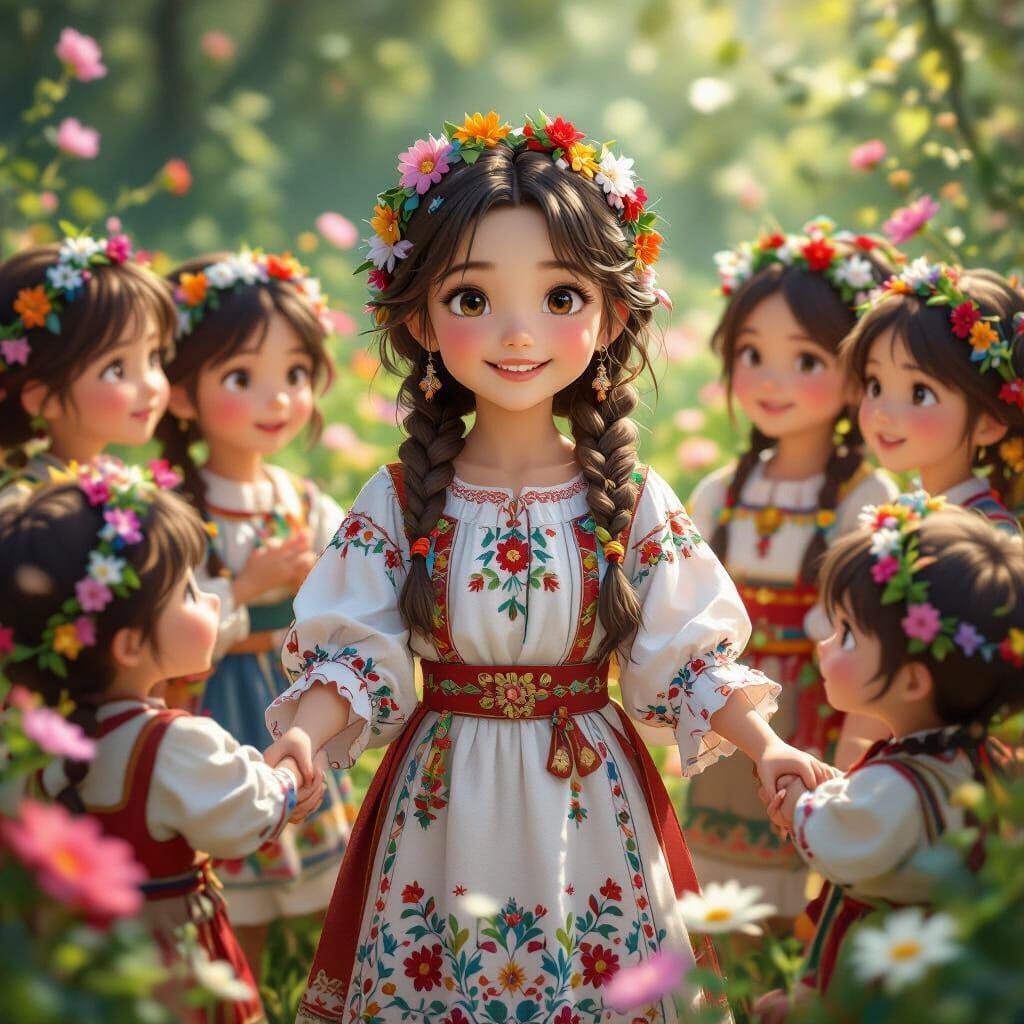 Easily generate your own images of children in Ukrainian costumes and blooming flowers with our free AI tool.