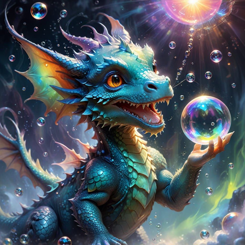 A close-up of a baby dragon playing with iridescent bubbles in a magical world. The image features soft, muted tones and intricate details in a fantastical, aetherpunk style.