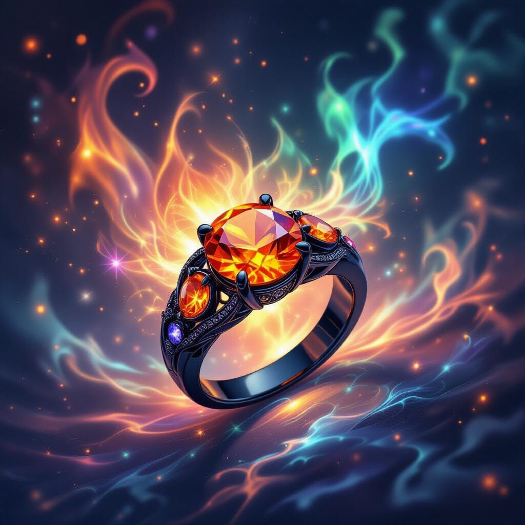 This image shows a black ring with an orange jewel, encircled by vibrant, mystical magic. The artwork features surrealist elements and a vivid color palette.