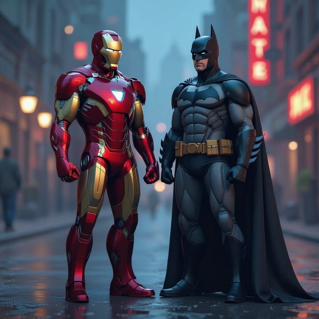 A hyper-detailed, cinematic portrait featuring Iron Man and Batman together, rendered in a vibrant comic book style with deep, complementary colors. High-resolution fantasy concept art.