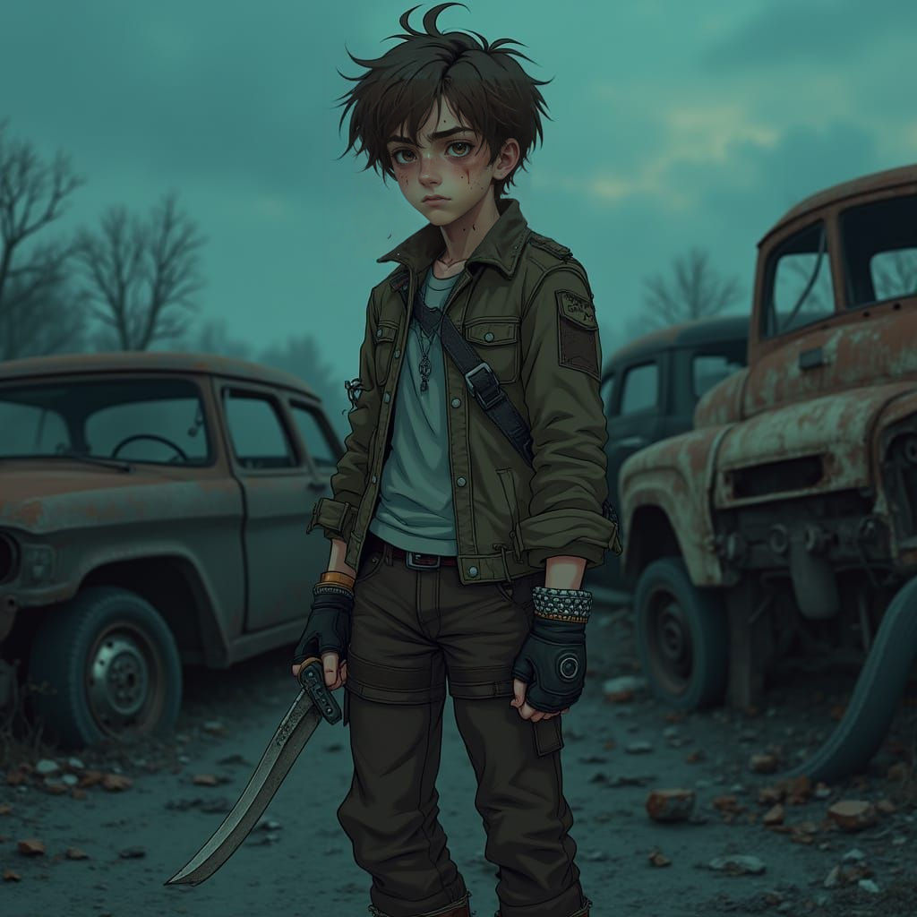 "A gritty teenage boy (13 years old but looks 18) with a tall, muscular build, sharp eyes, and messy short brown hair. He stands in a scrapyard at dusk, wearing layered thrifted clothes (sturdy boots, fingerless gloves, patched jacket). His face has faint scars, and his calloused hands hold a handmade knife. A worn dog-collar bracelet on his wrist glints in the dim light. Behind him are rusted cars and broken machinery. Moody shadows, hyper-detailed anime realism, dark teal and ..."
