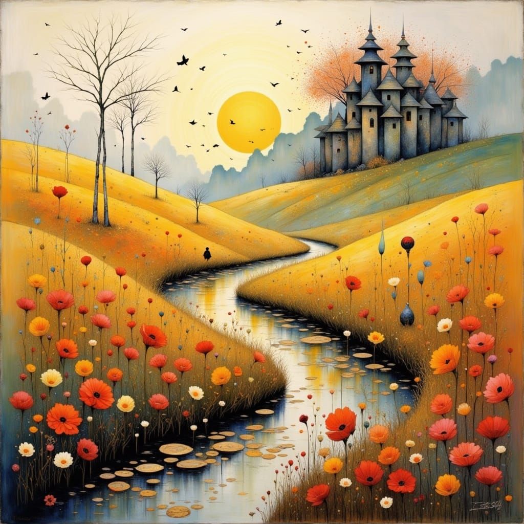 Richard Burlet, Mila Marquis, Luis Royo, Anna Silivonchik, Pino Daeni, characterful otherworldly spring meadow with a meanderingbrook, mixed media, Kimitake Yoshioka, Eric Lacombe, Jean Baptiste-Monge, Wadim Kashin, Willem Haenreates, rich vibrant ochre, lemon, white and gold colours and blends <lora:Earth ...