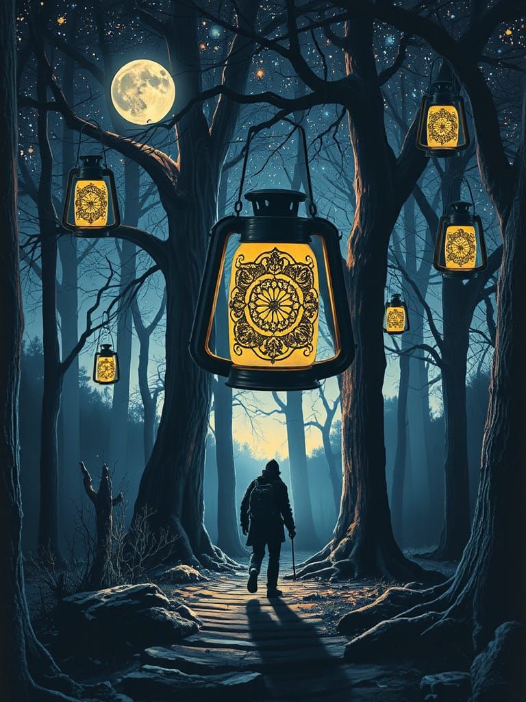 This image shows a solitary traveler holding a lantern in a dark forest under a starry sky. The art features high contrast and polychromatic colors, reminiscent of fantasy concept art.