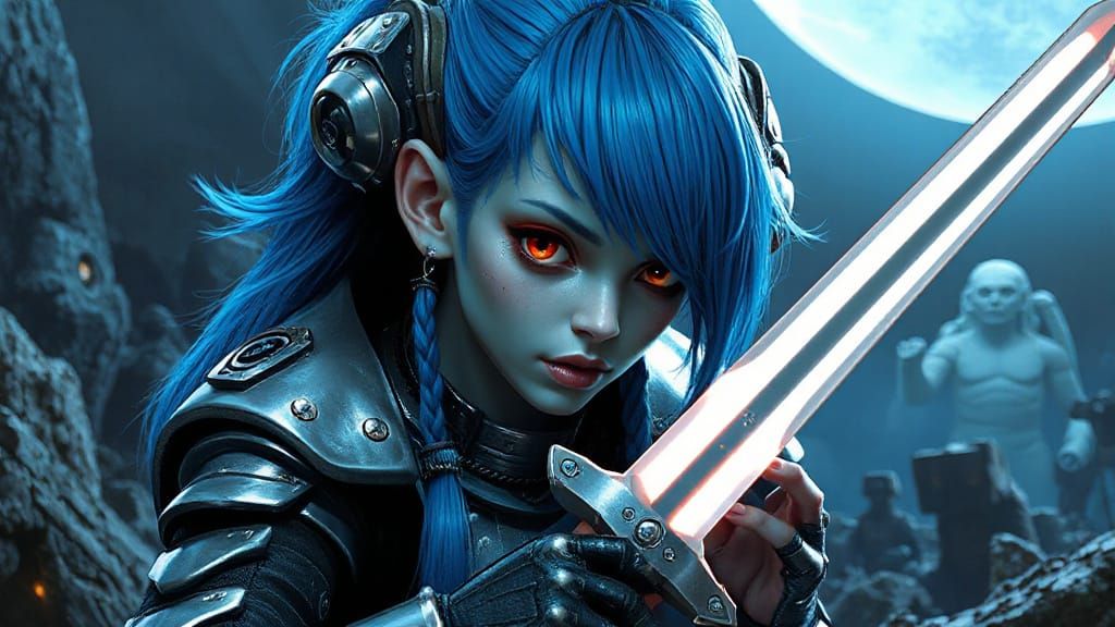 A fierce blue-haired alien warrior with glowing eyes and metallic armor on a dark planet. The image blends biomechanical, futuristic, and mystical artistic elements.