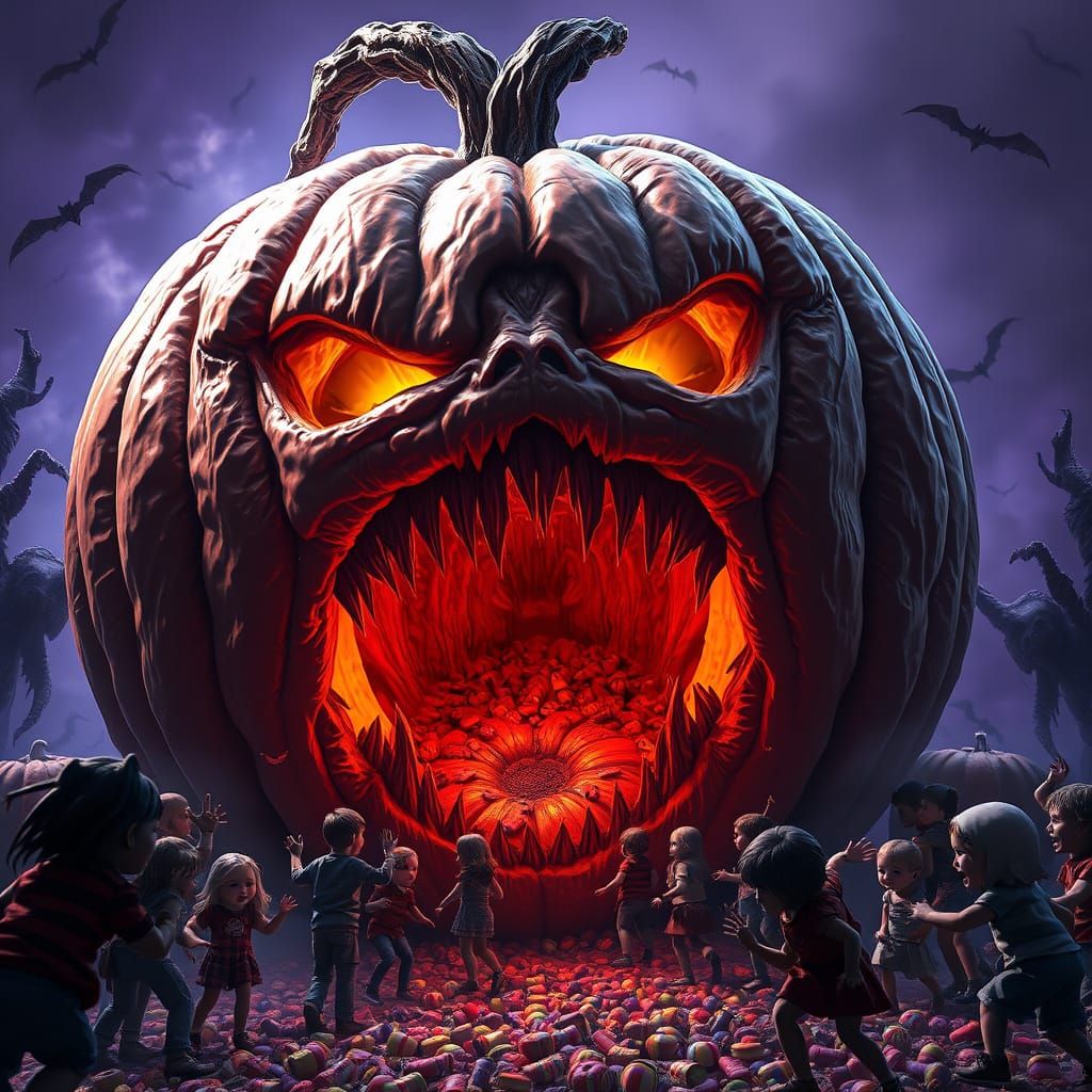 This dark fantasy concept art shows a giant, monstrous pumpkin consuming terrified children. The hyperdetailed scene features dramatic lighting and a purple and yellow color scheme, rendered in a hyperrealistic style.