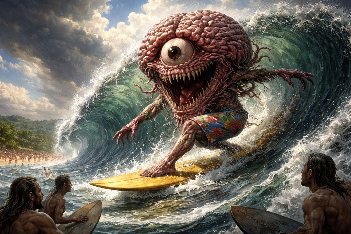 This image shows a monstrous brain on a surfboard riding a large wave. It features dramatic lighting and vivid colors, blending Baroque and Fantasy art influences.