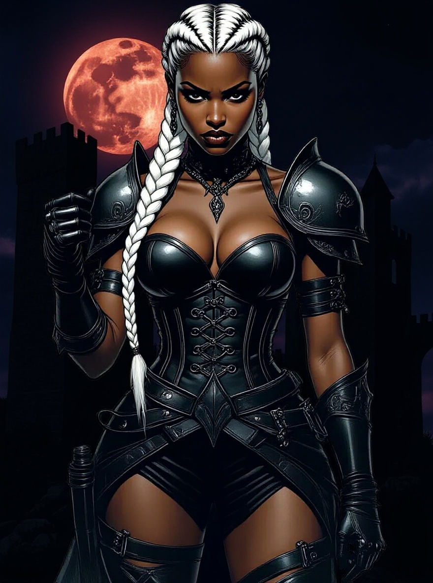 A striking picture of a female warrior in black armor holding a sword. The image, reminiscent of pen and ink drawings, captures her strength and sorrow with a limited color palette.
